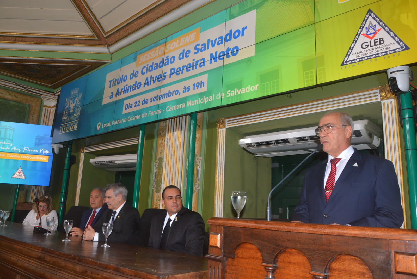 Em noite memorável, o Grão-Mestre da Grande Loja Maçônica do Estado da Bahia (GLEB), Arlindo Neto, foi homenageado na Câmara de Vereadores de Salvador com o "Título de Cidadão da Cidade do Salvador". Em uma linda festa, o Sereníssimo falou a todos que essa indicação homenageia um conjunto de todos os irmãos Maçons baianos e eleva a Maçonaria no estado. Essa honraria da Casa Legislativa reforça o trabalho da Maçonaria em nossa sociedade.