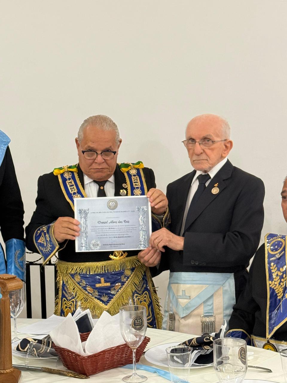 Durante o evento, foi entregue ao Irmão Daniel Alves dos Reis, o certificado Diamante, em reconhecimento aos seus 58 anos de Vida Maçônica.