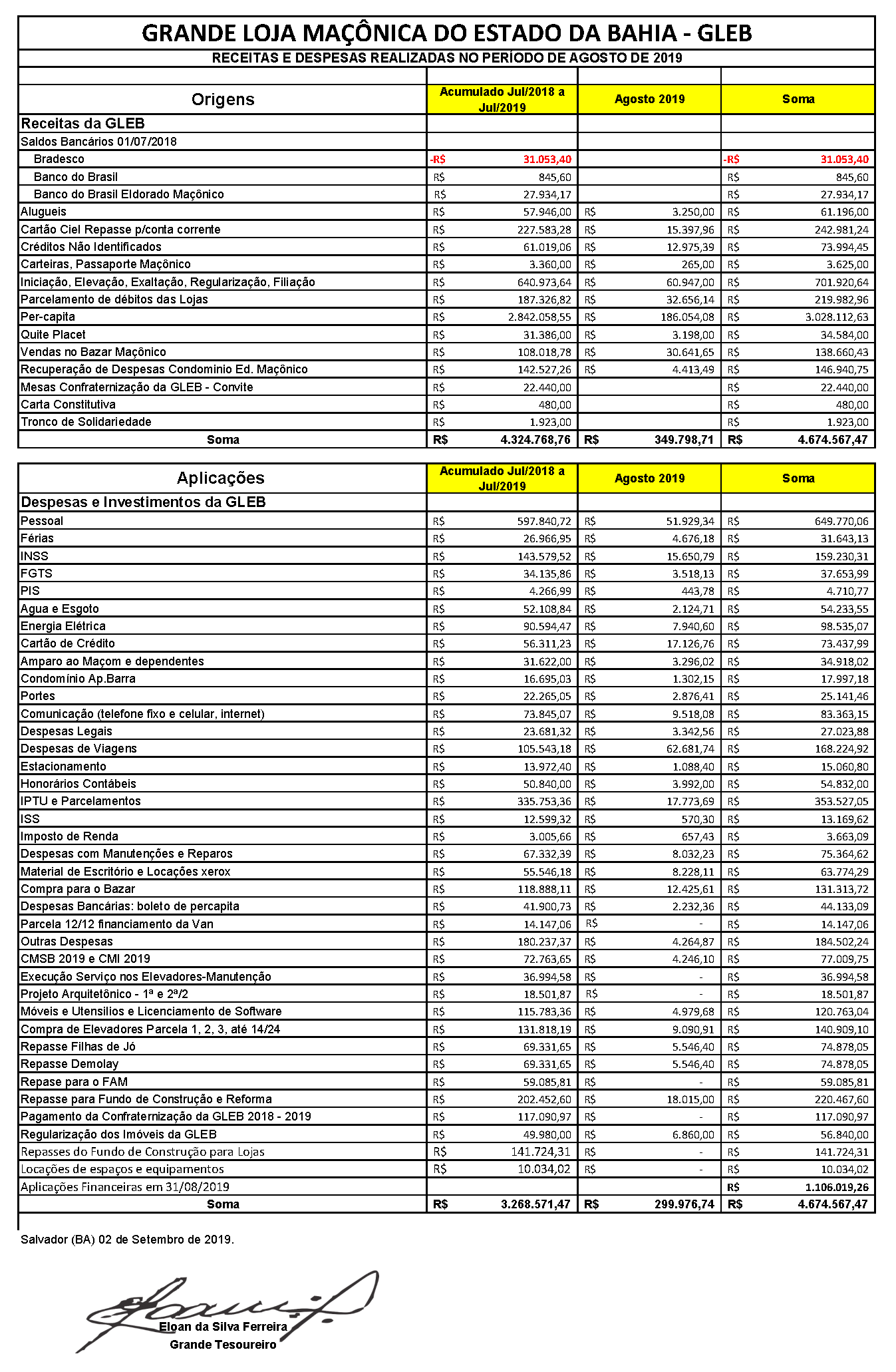 Confira os detalhes das receitas e despesas da Grande Loja realizadas no período de agosto de 2019.
