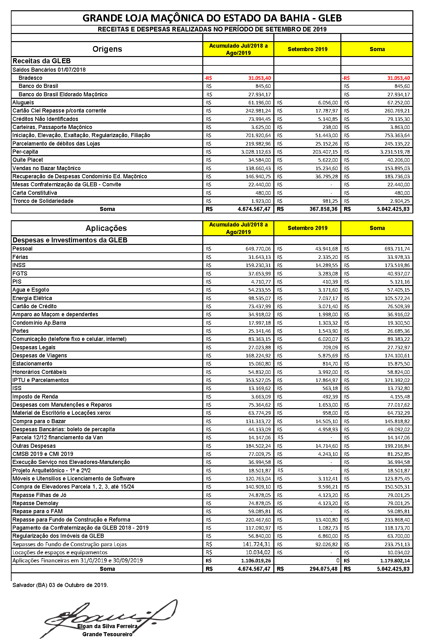 Confira os detalhes das receitas e despesas da Grande Loja realizadas no período de setembro de 2019.